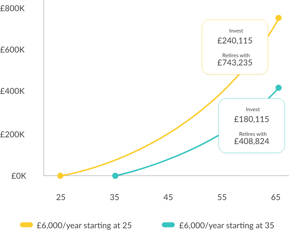 To explain it simply, compounding means that each year you make money on your principal and on past returns. For example if you have £100 one year and earn 10% interest, you’ll have £110 at the end of the year. Next year you could earn 10% on that £110, and so the growth could continue exponentially. The earlier you start, the more you’ll have time for this to work in your favour.