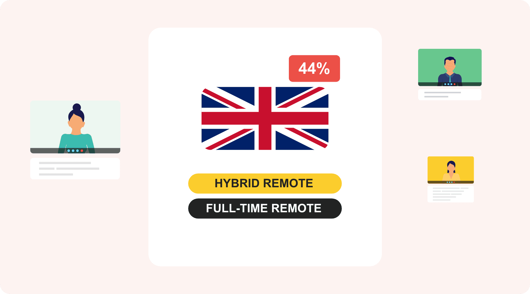 44% of UK British people work from home at least some of the time (hybrid or full-time remote)