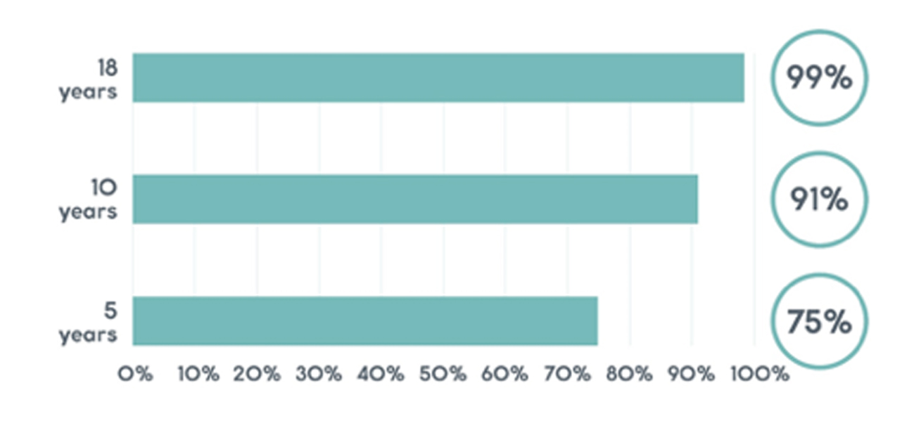 Here’s a graph that shows the percentage of times during the last 116 years that shares have beaten cash when held for five, 10 and 18 consecutive years*.